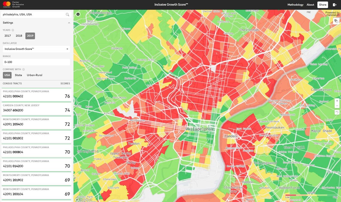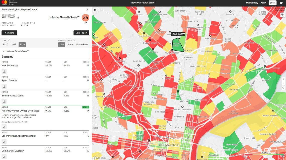 The Greater Philadelphia Metropolitan Region is rich in data. Numerous public and private organizations and agencies collect and share various forms of data that “data-translating” organizations—like the Economy League—use to analyze metrics of inclusive growth, equitable opportunities, and shared prosperity. As “meaning-makers and wayfinders” we are always on the hunt for new data resources especially as we build out our PolicyHub data repository. In this week’s Leading Indicator, we highlight the Inclusive Growth Score tool from MasterCard’s Center for Inclusive Growth - a new and exciting tool that compiles metrics of business development that are sorely lacking in other publicly available data.