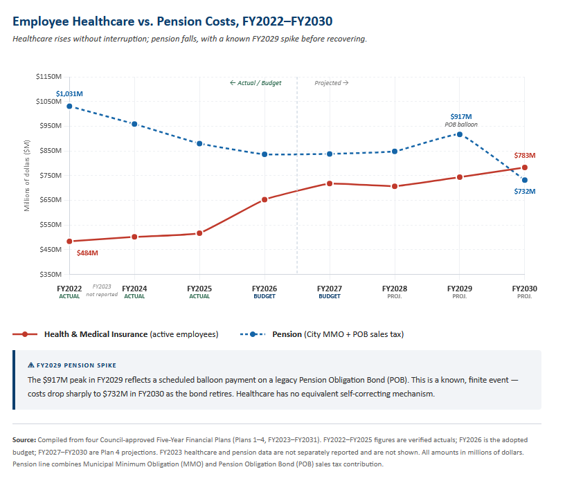 The contrast with pension costs is instructive. Pension obligations have actually fallen — from $1.031 billion in FY2022 to $838 million in FY2027 — reflecting the cumulative effect of a disciplined, multi-decade contribution strategy. A scheduled balloon payment on a legacy Pension Obligation Bond pushes costs to $917 million in FY2029 before dropping sharply to $732 million in FY2030 as the bond retires. That interruption is finite, visible, and already accounted for in the plan. Healthcare has no equivalent mechanism. There is no scheduled improvement, no actuarial trajectory toward resolution, and no containment plan described anywhere in the four Five-Year Financial Plans reviewed.[1]