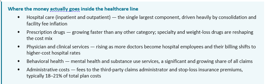 - These costs are not abstract — they pay for real, specific things. The healthcare line covers doctor visits, hospital stays, surgery, prescription drugs, emergency care, and behavioral health for roughly 26,000 active city employees and their dependents. A single employee hospitalization can cost $50,000 or more; newer weight-loss drugs like Ozempic run approximately $16,000 per patient per year. The city, as a self-insured employer, pays every one of those bills directly.[14]