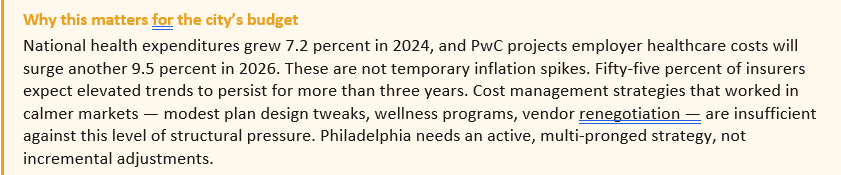 - This is not a new problem. In 2008, the Pew Charitable Trusts and the Economy League published “Philadelphia’s Quiet Crisis,” documenting that healthcare costs had risen 80 percent in five years and projected they would consume 28 percent of the city budget by FY2012.[5] The current trajectory is a continuation of that problem — one that has persisted across multiple administrations, dozens of labor contracts, and four successive Five-Year Plans without a documented management strategy.