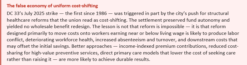 For Philadelphia, the equity concern is concrete. AFSCME DC 33 represents approximately 9,000 blue-collar workers — sanitation employees, water department staff, 911 dispatchers — earning an average of $46,000 per year, already more than $2,000 below the city’s own living wage standard.[17] Asking workers at that income level to absorb higher premiums or deductibles does not simply redistribute costs — it predictably reduces their use of primary and preventive care, worsens management of chronic conditions, and ultimately produces more expensive downstream care: emergency room visits, hospitalizations, and complications that cost far more than the routine care that was initially avoided.